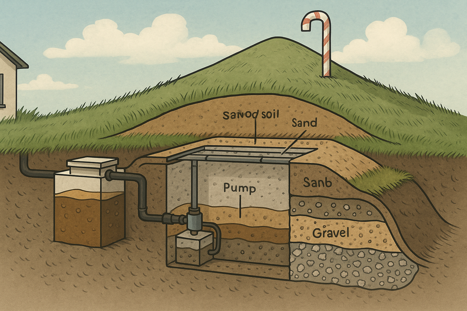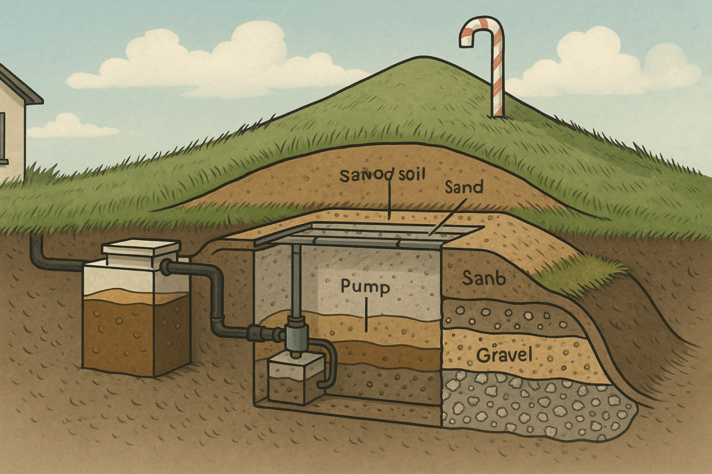 “Oh, I know what it is, Karen. This is important so pay attention. Naturally, I—Bizness, your unpaid emotional support feline and part-time investigative journalist—was intrigued. I dug deep. Well … figuratively. I am not a dog. What you have is The Hill of Digestive Destiny. The hill in the backyard is a poop palace. A waste water wonder mound. A majestic throne of filtration. And that candy cane pipe is its humble sentinel.”